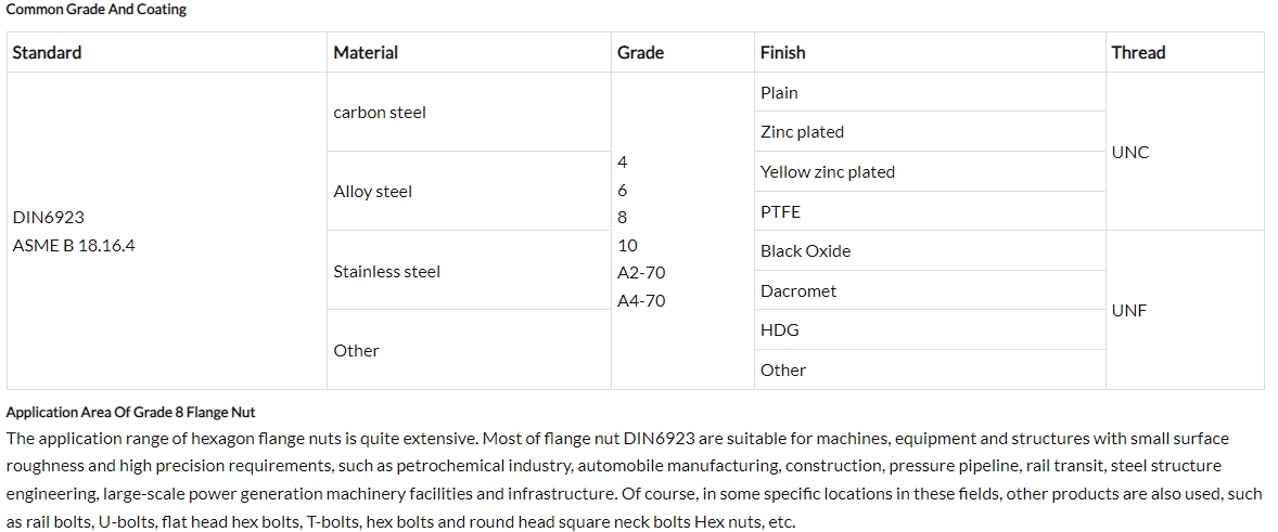 In summary, our Grade 8 Flange Nut is an excellent product that offers unmatched strength, durability, and reliability to any application that requires secure fastening. With its superior mechanical properties, flanged design, anti-corrosion treatment, versatility, easy installation, and competitive price, our nut is the ideal solution for any merchant looking for a dependable product that delivers exceptional value. We invite you to contact us today and experience the quality and reliability of our Grade 8 Flange Nut.