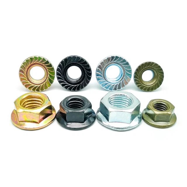 According to the strength, it is also divided into two categories, one is low strength flange nut grade 4, 6, and the other is high strength flange nuts grade 8, 10, 12. Yellow zinc flange nuts with a strength of 6 and below are low-strength types, and those with a strength more than 6 are high strength types. Among them, zinc plated grade 8 flange nuts are most common.